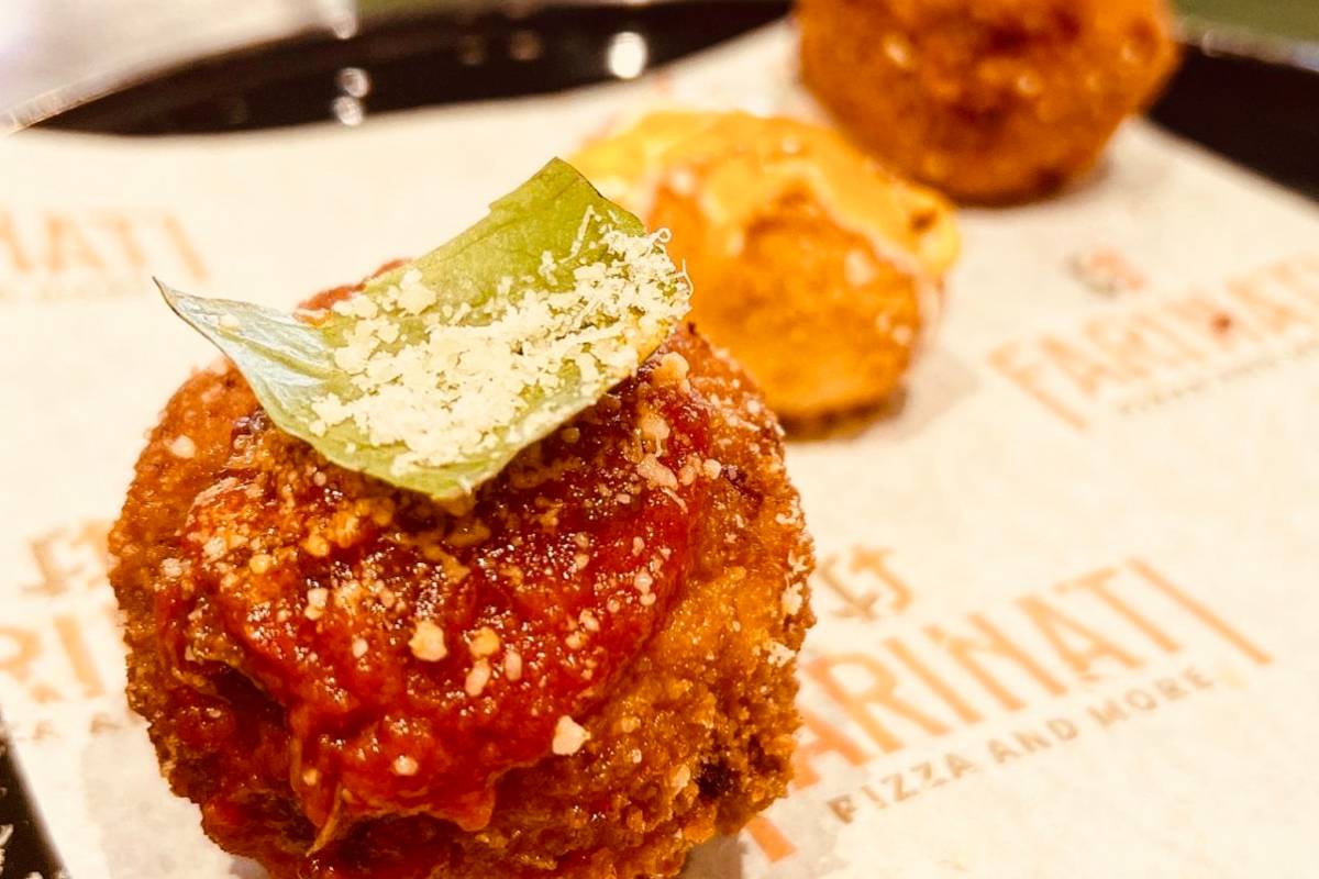 Per poi passare alle pizze con “Marinara in doppia cottura”, fritta e poi al forno, pomodoro San Marzano schiacciato a mano, aglio, origano del Mediterraneo, foglia di cappero campano, olive nere caiazzane, alici del Cantabrico, polvere di olive nere ed olio extra vergine d’oliva. “Margherita nel rutiello” con pomodoro pelato San Marzano, fior di latte dei monti Lattari, salsa al basilico, pecorino romano buccia nera, olio extra vergine d’oliva. “Baciata croccante” in doppio strato, con pomodorini rossi e gialli semi-dried, prosciutto crudo culatello, fonduta di mozzarella bufala, salsa alla rucola e olio extra vergine d’oliva e la “Farinati Mood” con mozzarella di bufala campana DOP, confettura di “pellecchielle” del Vesuvio, guanciale di Amatrice, rucola liquida, Provolone Del Monaco DOP, basilico, olio extra vergine d’oliva.
