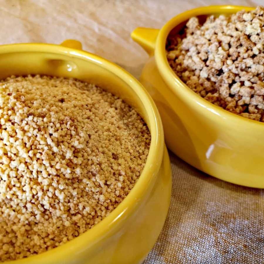 Era uso preparare questa pasta, principalmente nelle case contadine. La semola di grano duro, uno dei cereali più coltivati in Sardegna, veniva lavorata con acqua e sale. Si strofinava con i polpastrelli, ripetendo un movimento circolare delle mani, all’interno di grandi contenitori di terracotta, fino a ottenere piccoli granelli omogenei che ricordavano delle briciole. Questo processo, noto come “incocciatura“, veniva spesso eseguito in gruppo, e rappresentava un momento di socialità per le donne dei paesi.