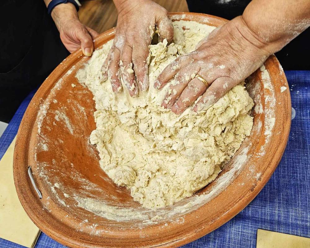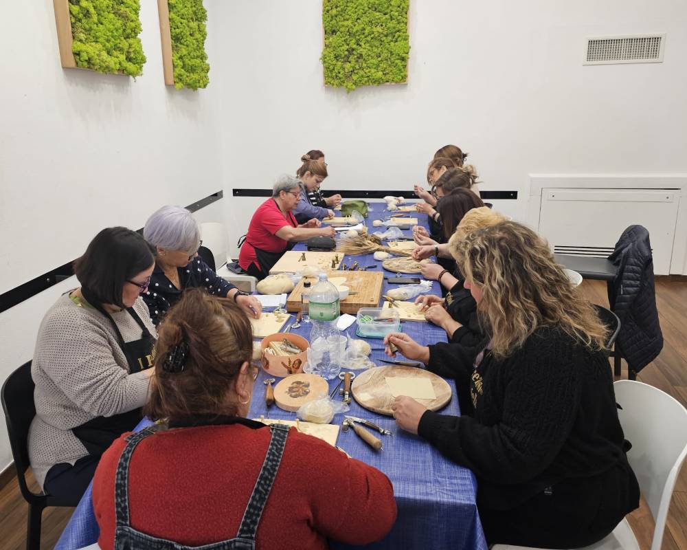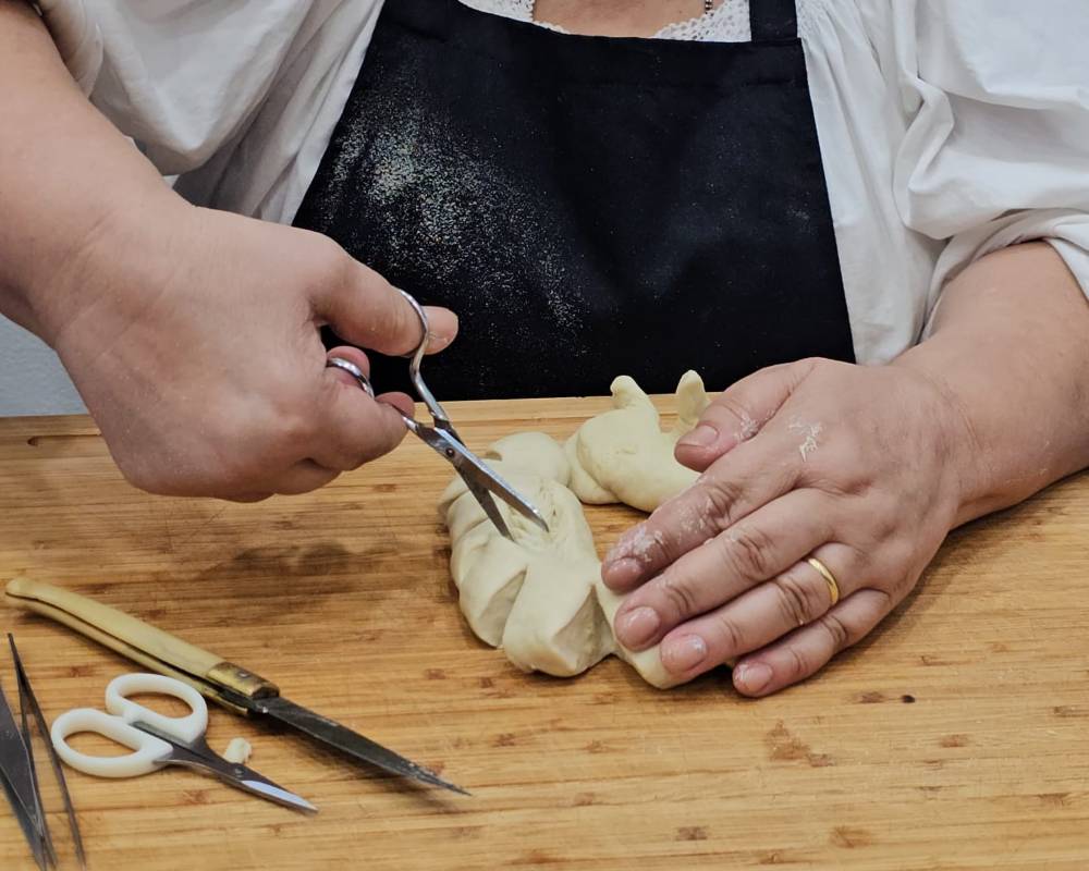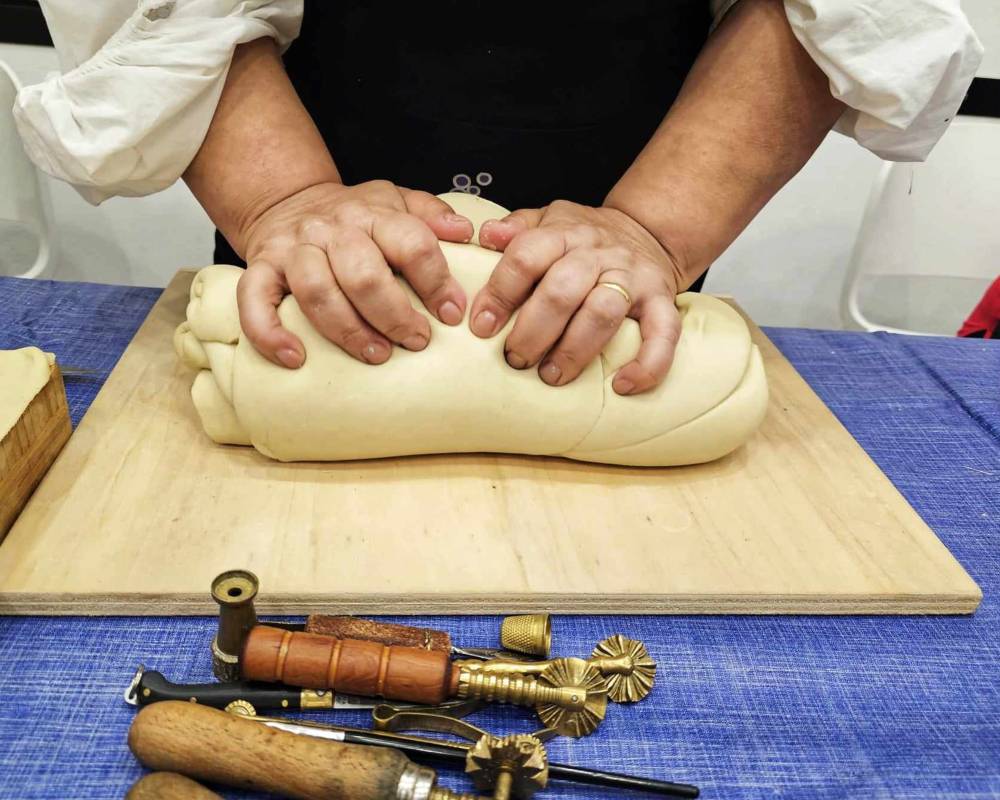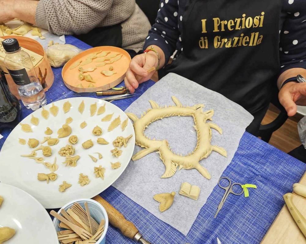 Il corso, dopo che le allieve si sono alternate nell’impastare la semola con l’acqua e il lievito, entra nel vivo con la realizzazione di piccole forme riccamente decorate con soggetti propiziatori e beneauguranti, portatori di pace, prosperità e rinascita.