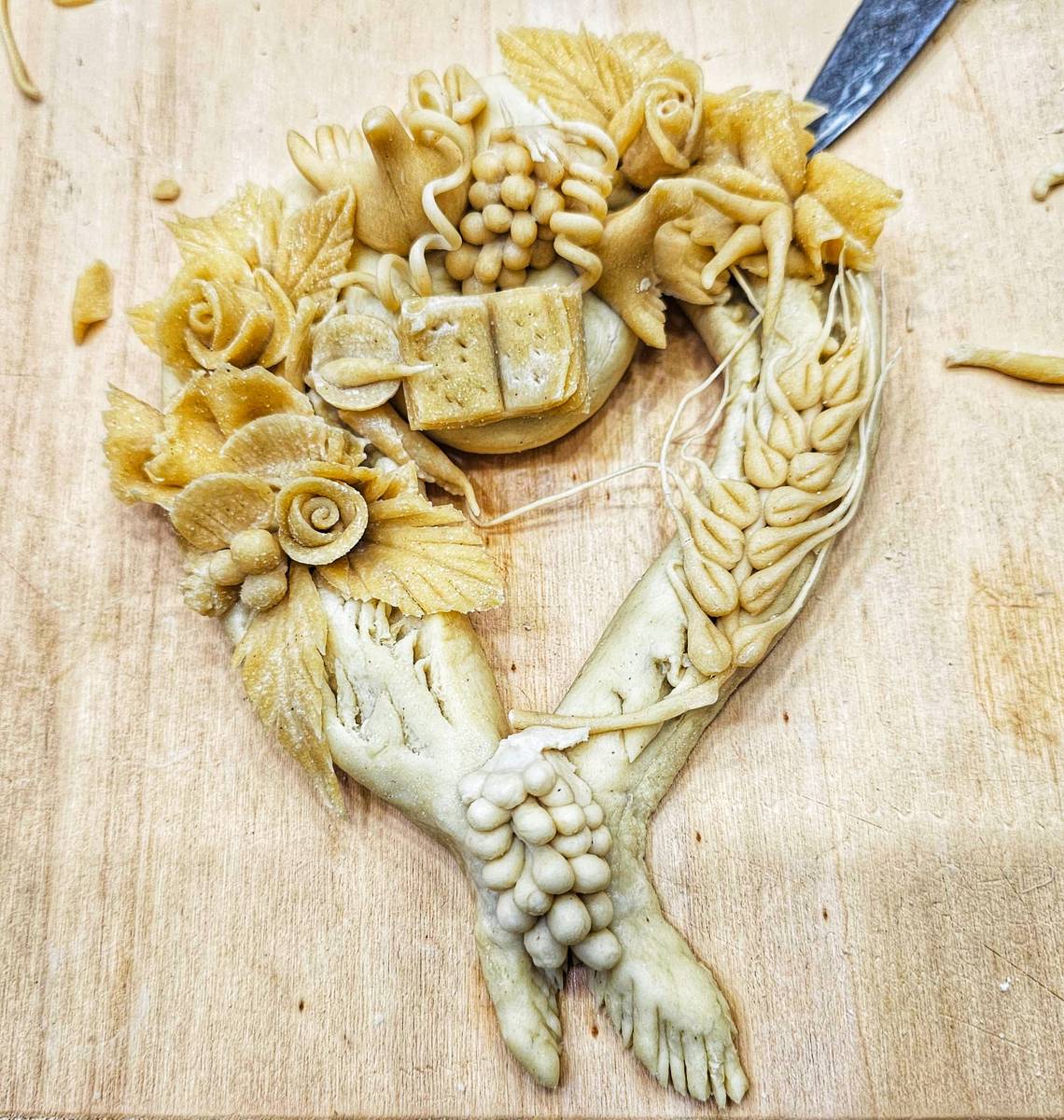 Piccole colombe con le ali spiegate e il becco rivolto al cielo prendono vita. Pronte ad essere circondate da fiori, foglie, spighe, grappoli d’uva e libri sacri. Ogni ornamento ha un significato e una volta cotti, i pani votivi si trasformano in veri e propri oggetti d’arte.