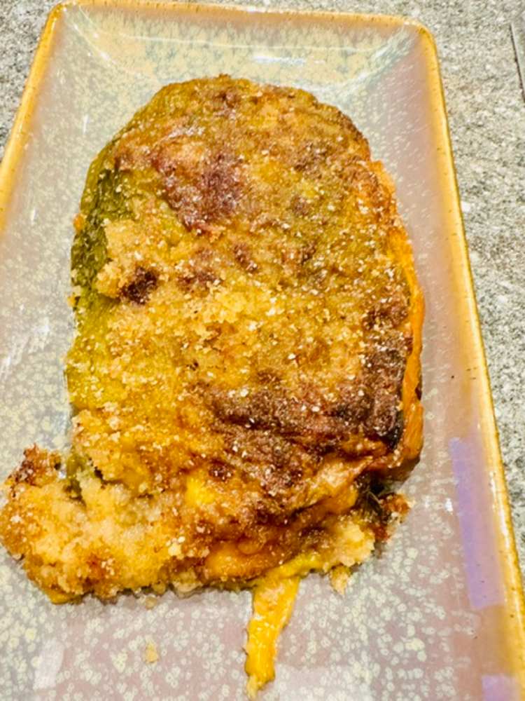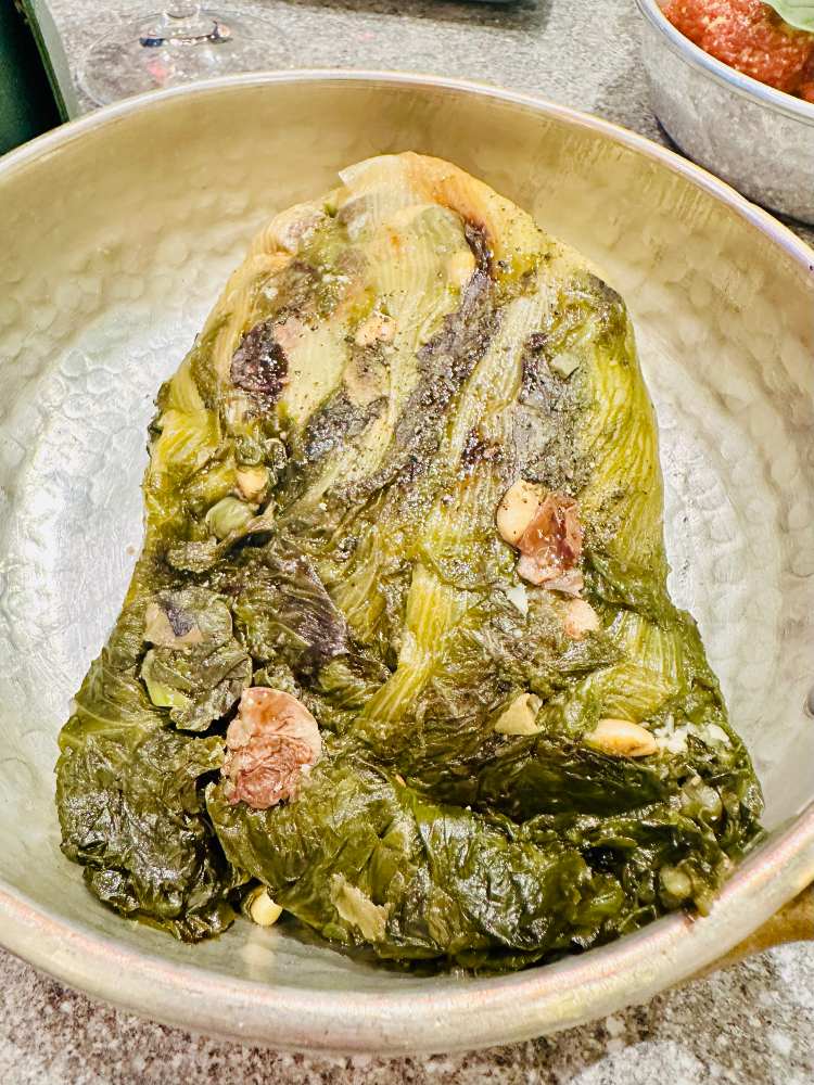 Per gusto personale, seppur quasi a fine stagione, segnaliamo una ricca e ben eseguita scarola ripiena. Un tripudio di uvetta, pinoli, olive e capperi racchiusi nel morbido abbraccio della verdura. Un piatto di “scammaro” che non vi farà rimpiangere le proteine animali.