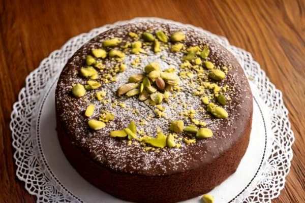 Montate in una terrina tre uova intere con 180 g di zucchero in polvere e una presa di vaniglia, dopo cominciato a montare aggiungetevi ancora tre uova intere, uno per volta. Quando tutto sarà ben montato unite 120 g di farina o Maiorca mescolata a un cucchiaio d’amido, tre cucchiai di cacao in polvere, 80 g di burro sciolto e se si vuole qualche pignolo e pistacchi a pezzetti. Versate il composto in uno stampo a timballo imburrato e polverizzato di farina e cuocere a forno moderato. Servire freddo e polverizzato di zucchero. Volendo si può servire glassato alla cioccolata e così è più adatto per dolce da tavola.