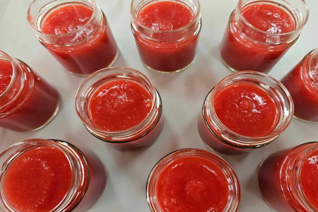 Il macchinario frulla, cuoce e addensa contemporaneamente. Molto importante aggiungere del succo di limone appena spremuto, per dare un sapore più equilibrato. Ma soprattutto per regolare il pH, permettendo una conservazione migliore della crema di frutta.