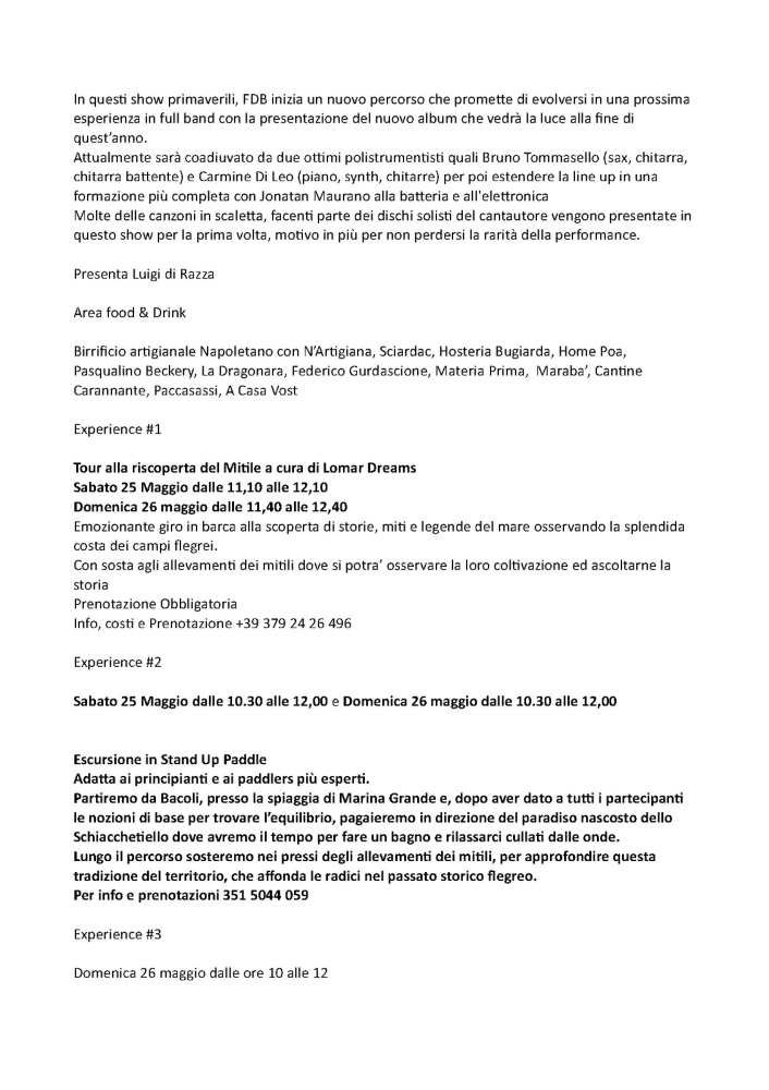 Durante le due giornate dalle 18 sarà attiva l’Area Ludica dove si alterneranno spettacoli, come il ‘Teatro nel Baule’, laboratori e giochi per i bambini e il ‘Ludobus’. A seguire, dalle 21 inizieranno gli spettacoli musicali: sabato sul palco ci sarà il musicista e cantautore Andrea Tartaglia che presenterà in esclusiva nei Campi Flegrei il suo nuovo disco. Ospite speciale della serata Valerio Jovine con il suo ‘reggae napulitano’.