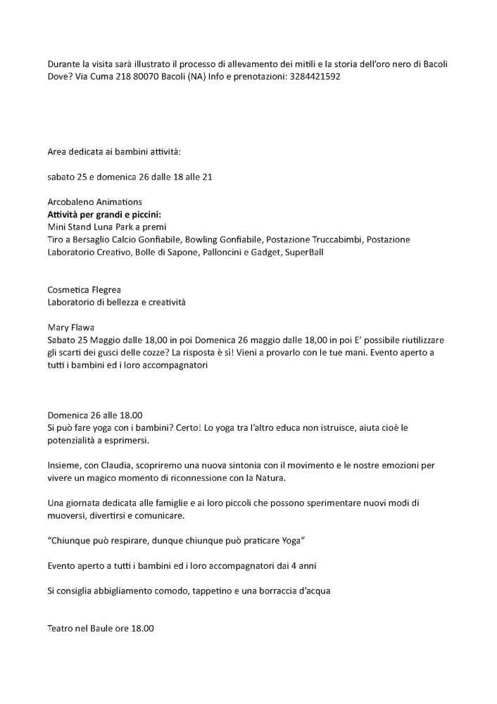 Insomma una combinazione di elementi che, attraverso questa prima manifestazione, intendono dare più luce a un prodotto dell’agroalimentare locale che meriterebbe di diventare sempre più attrazione per viaggiatori alla ricerca di speciali esperienze immersive da coniugare al patrimonio archeologico, storico, culturale e paesaggistico di cui Bacoli e i Campi Flegrei dispongono.