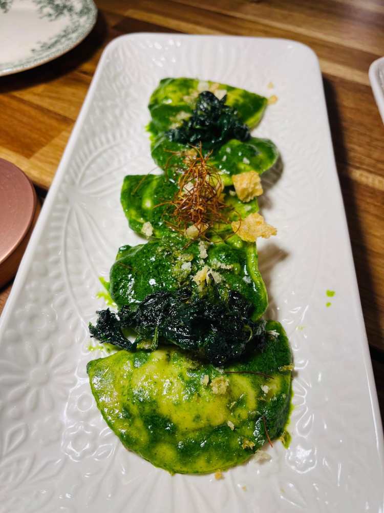 Notevole l’accostamento tra baccalà, friariello e peperone crusco nel raviolo che richiama le diverse anime del locale.