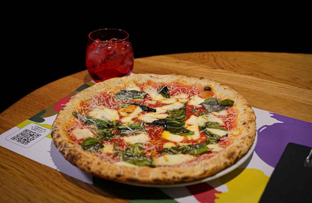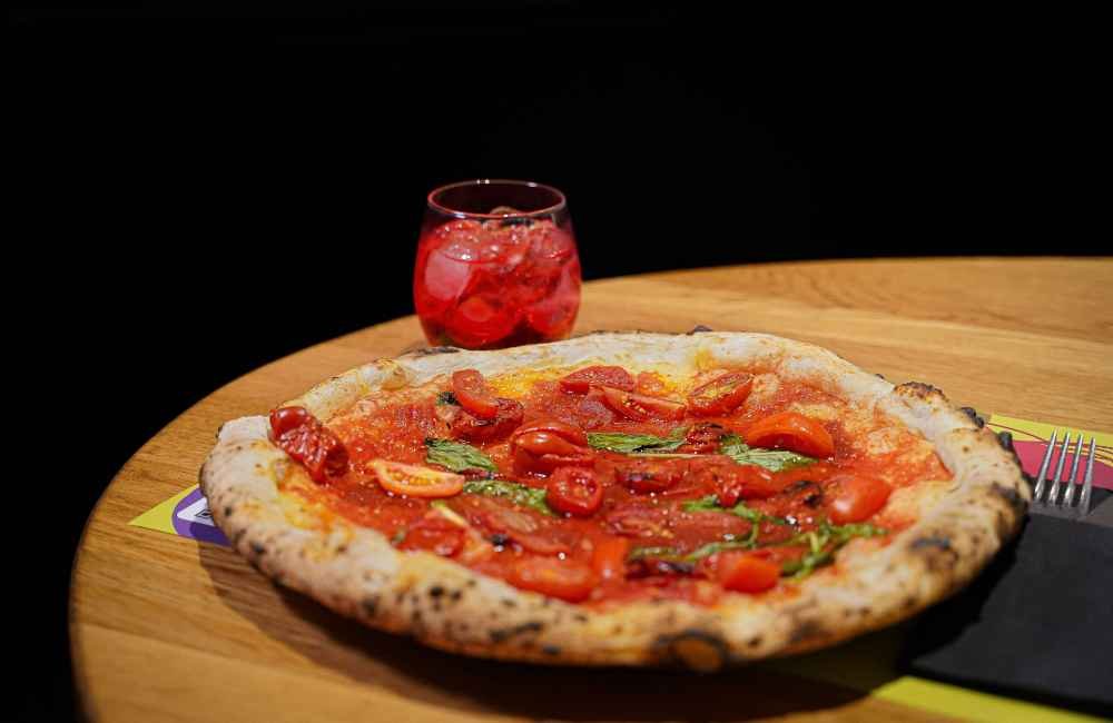 Il percorso gustativo è proseguito con la Pizza provola e pepe by Dry, una margherita rivisitata con provola affumicata e pepe nero di Sarawak, abbinata ancora all’Hibiscus Margarita, che con il suo equilibrio acido e dolce ha esaltato la sapidità del piatto.