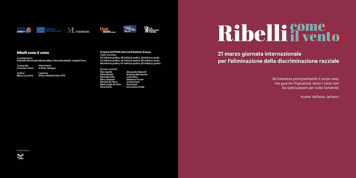 A Bologna la settimana d’azione contro il razzismo, promossa ogni anno da UNAR – Ufficio Nazionale Antidiscriminazioni Razziali, si celebra con il progetto artistico “Ribelli come il vento” e con una Festa di strada artistica e musicale in piazza Lucio Dalla il 21 marzo.