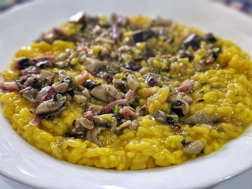 Risotto alla milanese con funghi cardoncelli trifolati e pancetta
