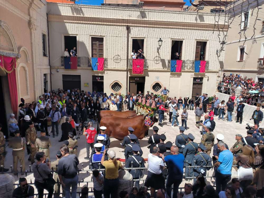 Alle prime luci dell’alba, la chiesetta di Stampace è stata avvolta da un’atmosfera solenne. La prima messa si è svolta prestissimo, seguita da un gran numero di fedeli. La manovra di aggiogamento dei possenti buoi è avvenuta nella piazzetta antistante la chiesa. Poi, a fine mattinata dopo il doveroso saluto militare, avvolto dal profumo delle erbe aromatiche lanciate dai balconi decorati con drappi di velluto rosso, il cocchio contenente il simulacro di Sant’Efisio si è lentamente fatto largo nella stretta via, per iniziare il consueto programma.