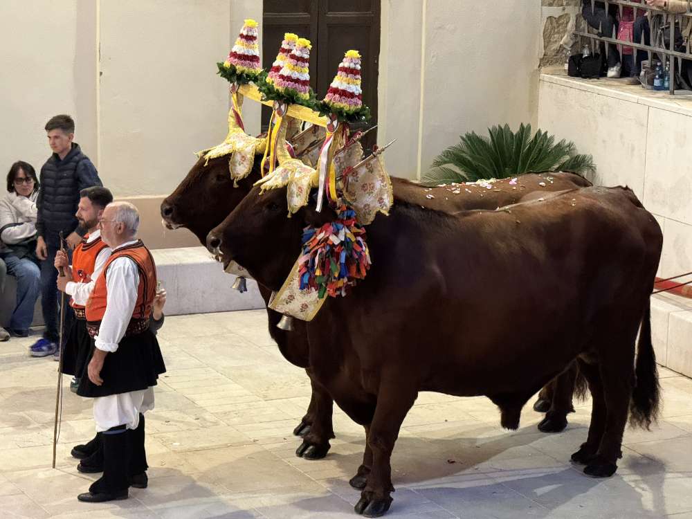 Ogni elemento della festa racconta una storia. Tra le più singolari c’è quella dei i buoi che hanno trainato il cocchio. Anche quest’anno caratterizzati da curiosi nomi. “Fairi Biri” e “Chini Sesi”, un richiamo giocoso al senso di identità: “Fatti vedere, Chi sei”. Allevati dalla famiglia Cabras di Monserrato, questi imponenti animali, di razza Bruno Sarda, sono stati addobbati con la “Cuncordia de Sant’Efis”. Un finimento prezioso in broccato e seta, arricchito da campanelle e nastri colorati.