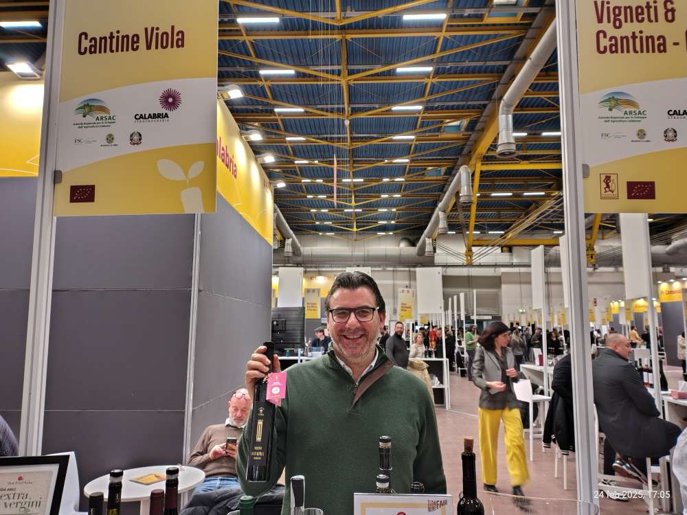 Nella foto Alessandro Viola (Cantine Viola) con una bottiglia della versione speciale del Moscato Passito di Saracena “Luigi Viola”.