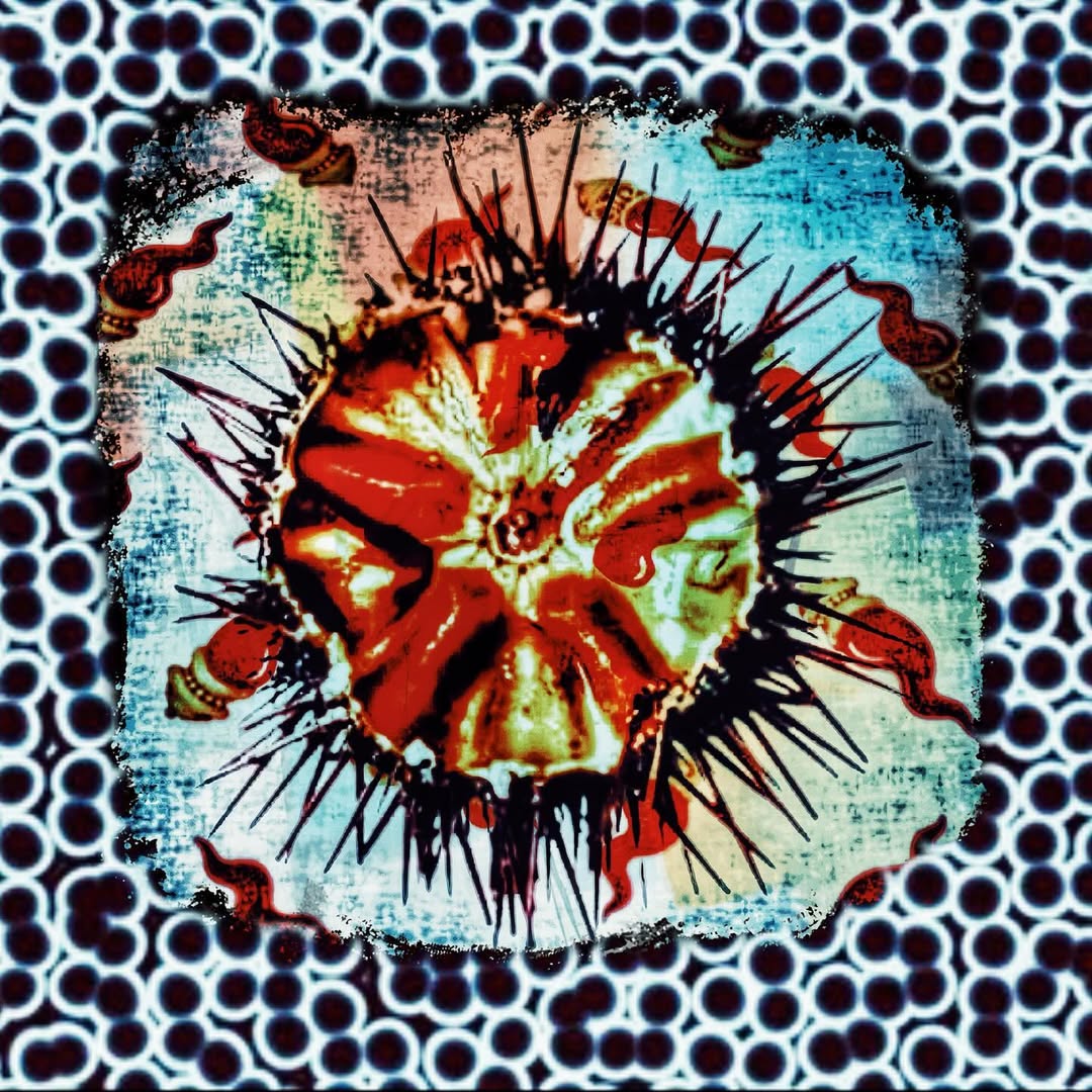Lo sfondo è un’astrazione ricca di texture rosse e nere, con un effetto pittorico e materico. Lo stile è un mix tra collage, street art e illustrazione digitale, con forti contrasti e dettagli intricati.