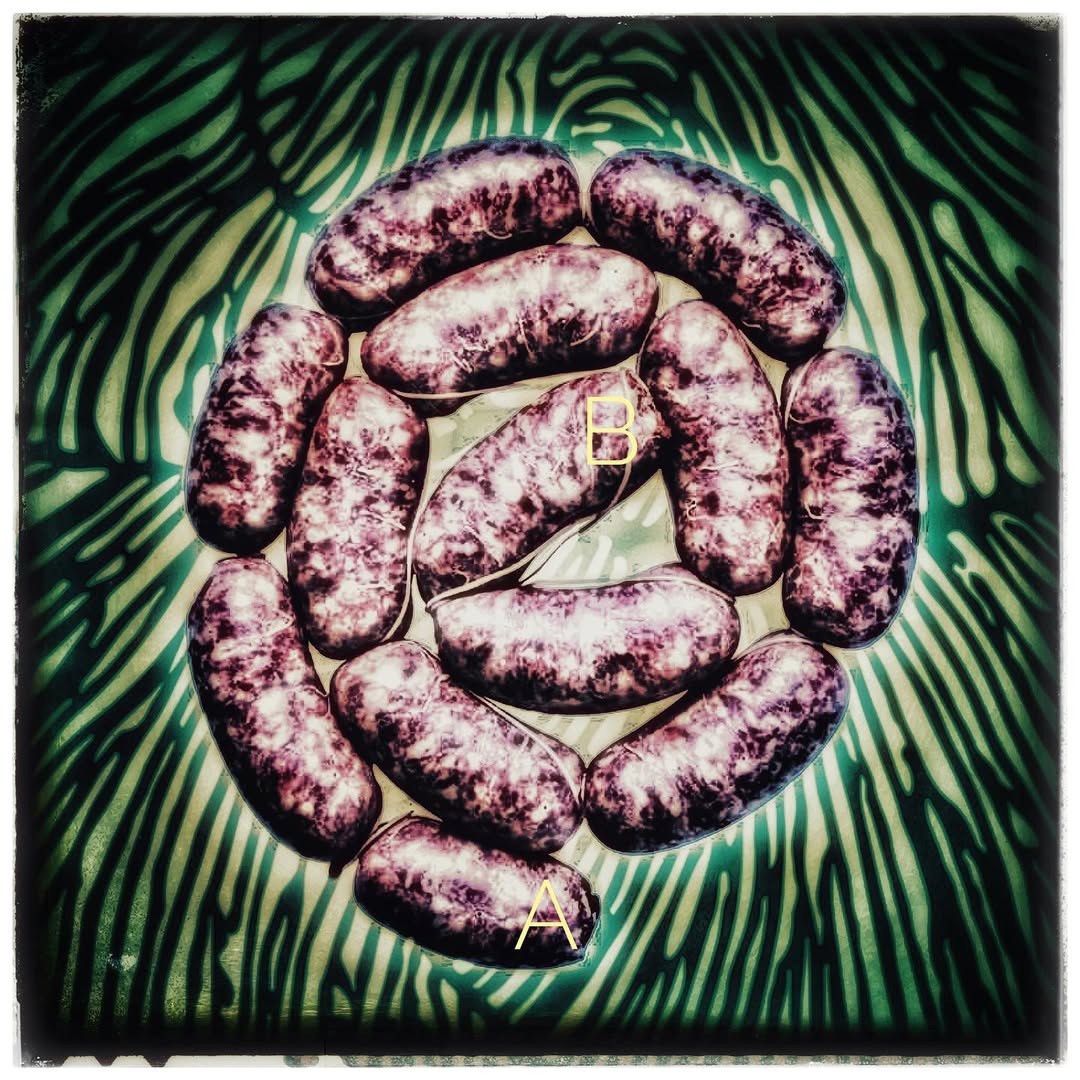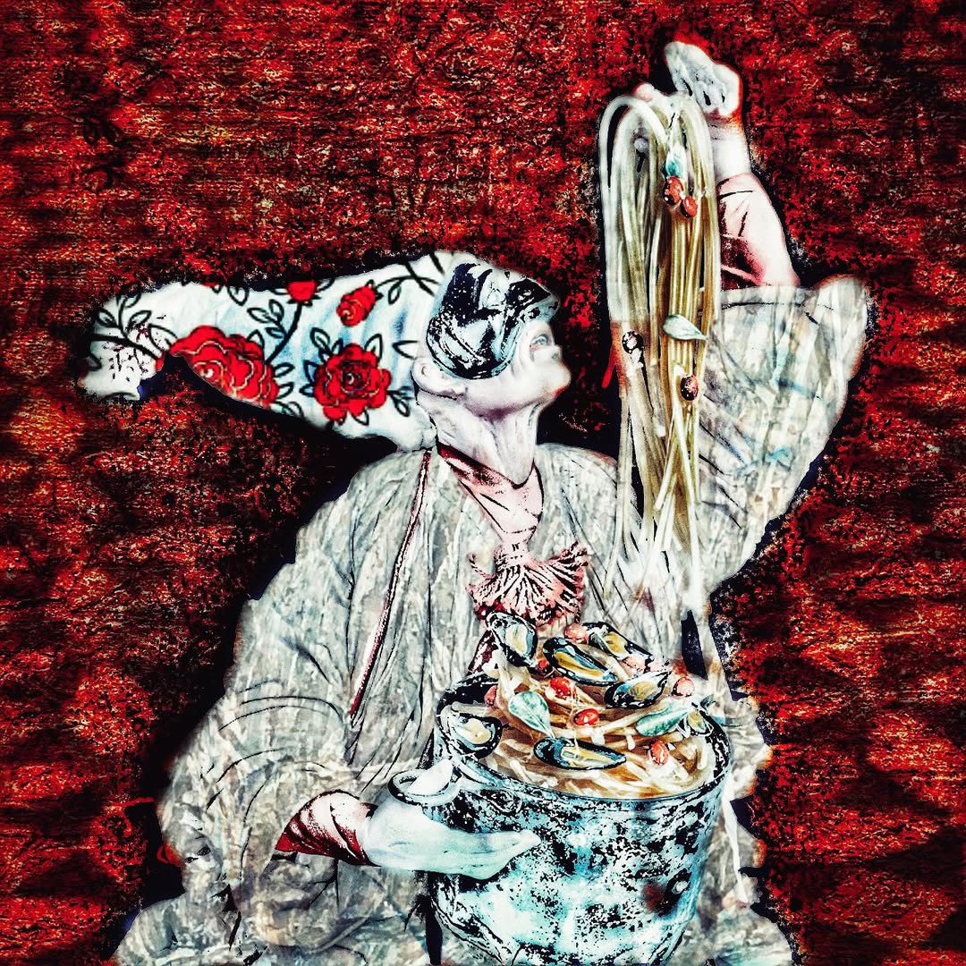 La figura mascherata, con un cappello insolito decorato con rose rosse e bianche, solleva un lungo fascio di spaghetti che si appresta a gustare, mentre tiene in mano un grande recipiente pieno di pasta e frutti di mare. Facile accostarla al Principe Antonio de Curtis in “Miseria e nobiltà”.