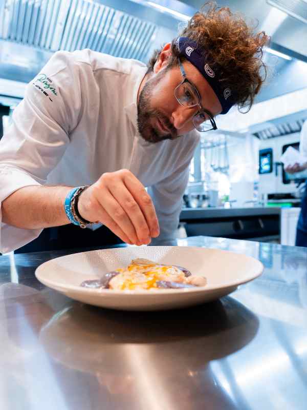 Saranno presenti piatti cult della nostra tradizione gastronomica rivisitati dall’estro dello chef, e non mancheranno abbinamenti inaspettati. Spaghetti con aglio fermentato, calamaretti spillo e whisky, ma anche cavatelli quintessenza di mare, mandorla e dragoncello, e ancora triglia alla pizzaiola, salicornia, chips di riso latte di riso e pomodorini. Senza scordare i dolci: panna cotta al sesamo, finocchi caramellati, sorbetto di mela e cioccolato bianco caramellato.