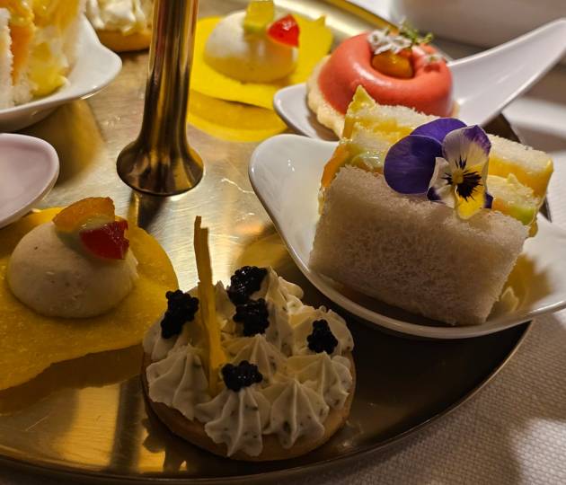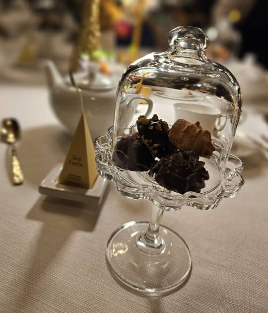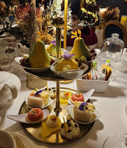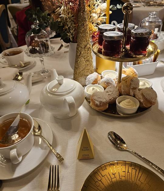 La tavola, apparecchiata con un servizio da tè, con tazze e piattini in fine porcellana bianca, fiori freschi, e posate disposte con cura, è imbandita con una vasta selezione di tè di alta qualità. I pasticcini, i dolcetti e i finger food sono il cuore di questa esperienza, che si abbinano perfettamente con i tè e le tisane proposte.
