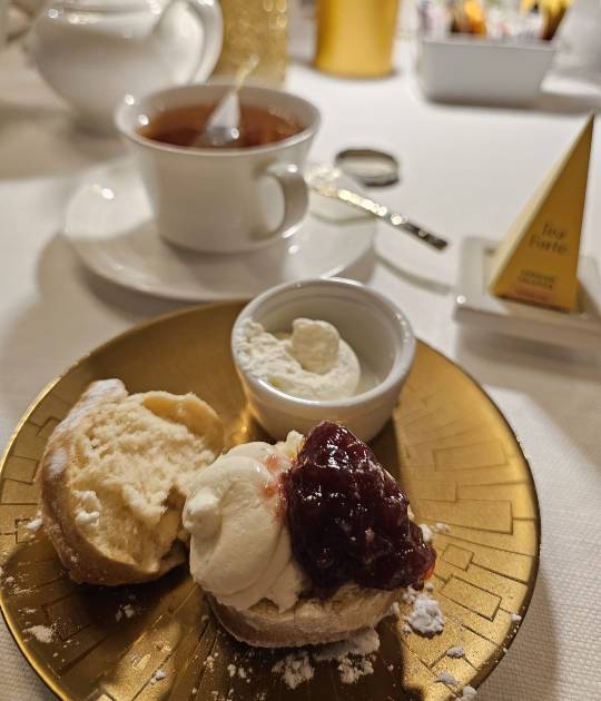 Un posto d’onore occupano gli Scones appena sfornati, serviti con una crema a base di panna e mascarpone, e marmellata di lamponi. Gli scones sono soffici e burrosi, perfetti per essere divisi a metà e spalmati con i deliziosi condimenti.